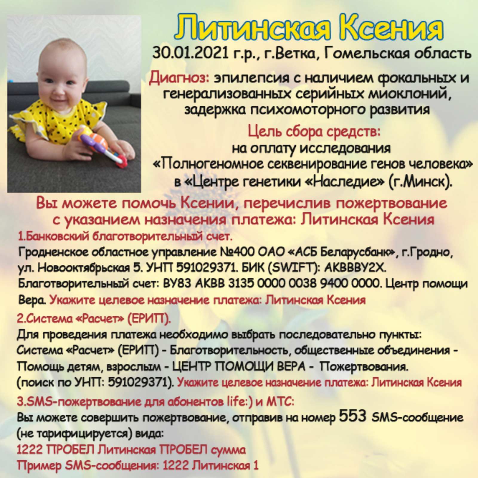 Маленькому жителю г.Ветки ЛИТИНСКОЙ КСЕНИИ требуется помощь на оплату исследования в Центре генетики «Наследие» в г.Минске для дальнейшего лечения от тяжелого недуга. Для молодой семьи сумма в 9100 бел. рублей оказалась неподъемной. Просим всех неравнодушных жителей откликнуться и помочь девочке, перечислив пожертвование на указанный расчетный счет.