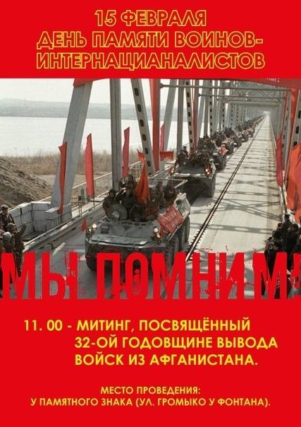 15 февраля состоится митинг, посвящённый 32-ой годовщине вывода войск из Афганистана