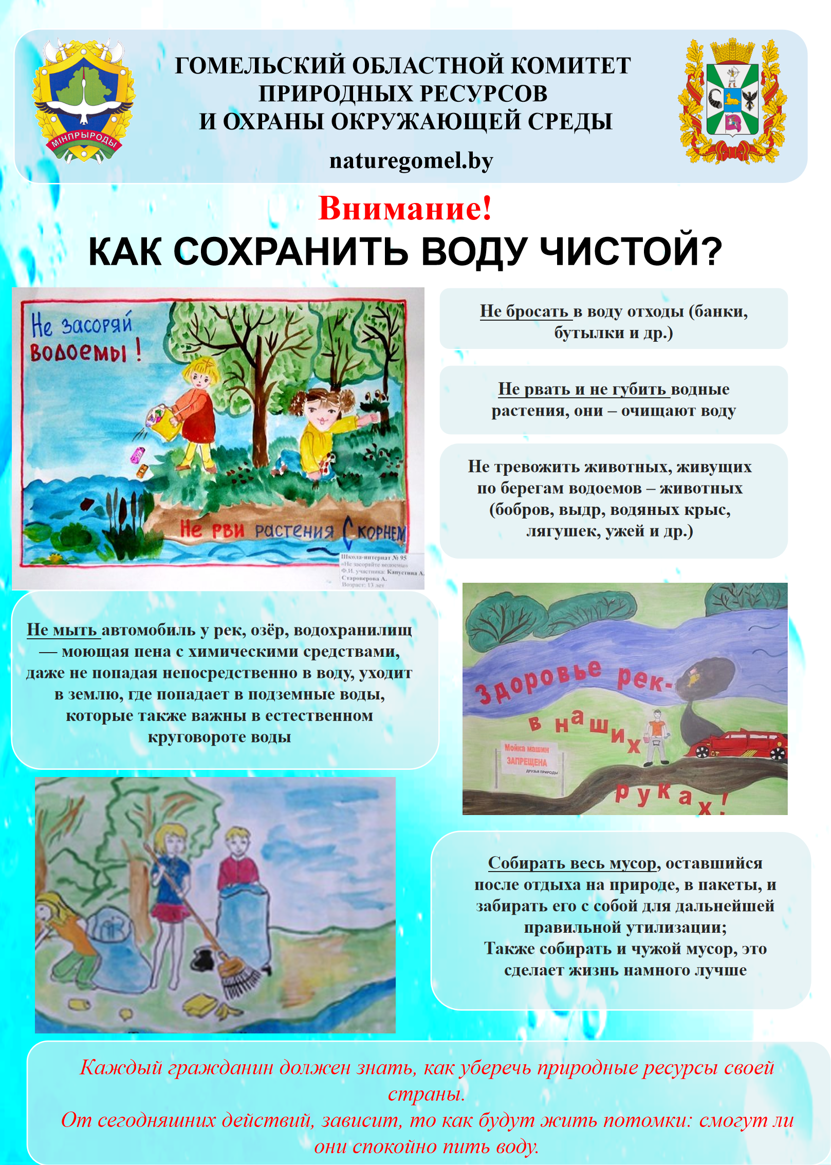 В Гомельской области, уделяется особое внимание и ежегодно проводится ряд тематических мероприятий по вопросам бережного отношения к водным ресурсам. В текущем году планируется проведение акций по уборке территории прилегающие к местам массового отдыха на водотоках, озерах, прудах, водохранилищах, обустройству родников.