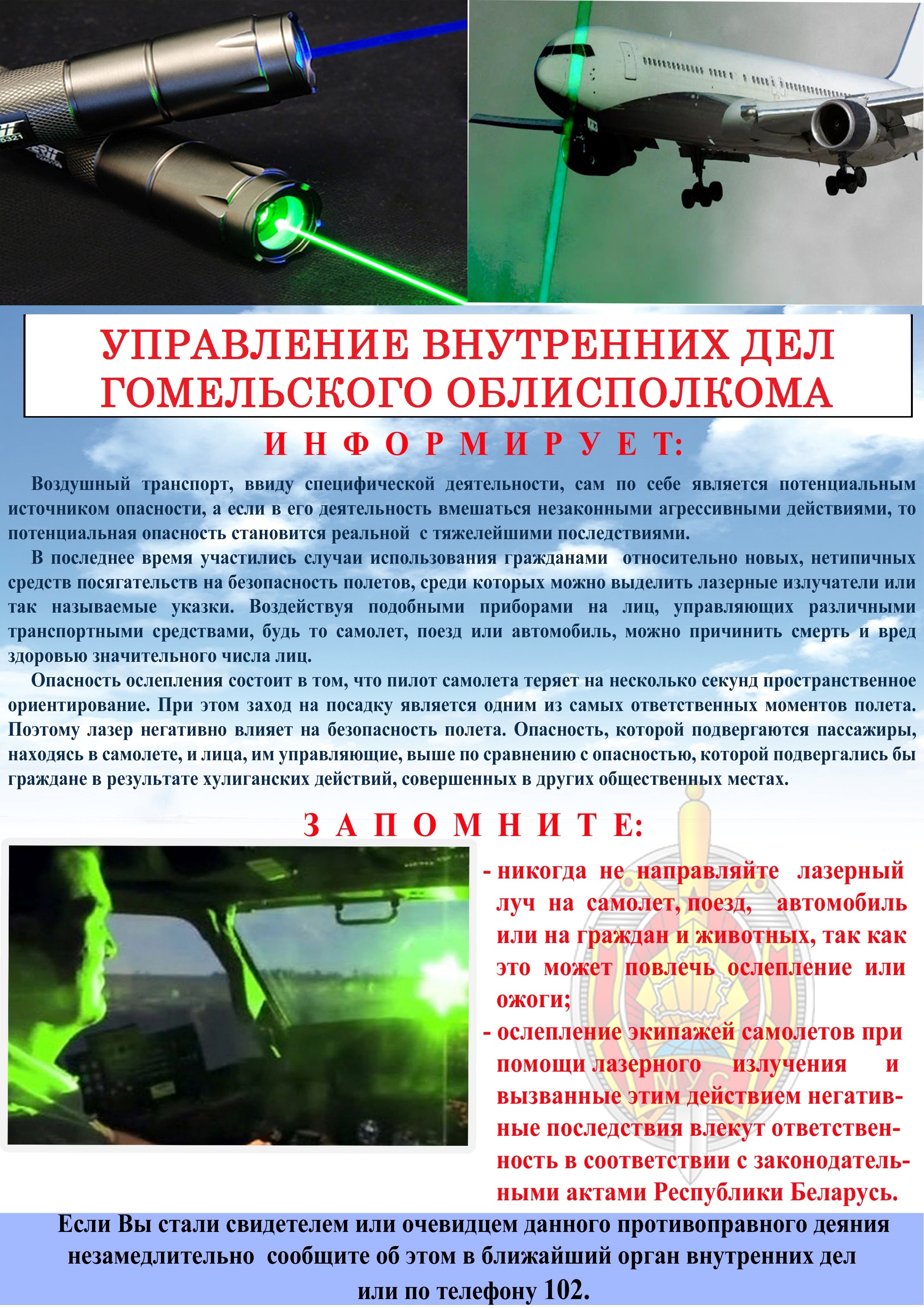 Кроме этого, органы внутренних дел напоминают, что в последние годы участились случаи использования гражданами относительно новых, нетипичных средств посягательств на безопасность полетов, среди которых можно выделить лазерные излучатели, или так называемые указки.