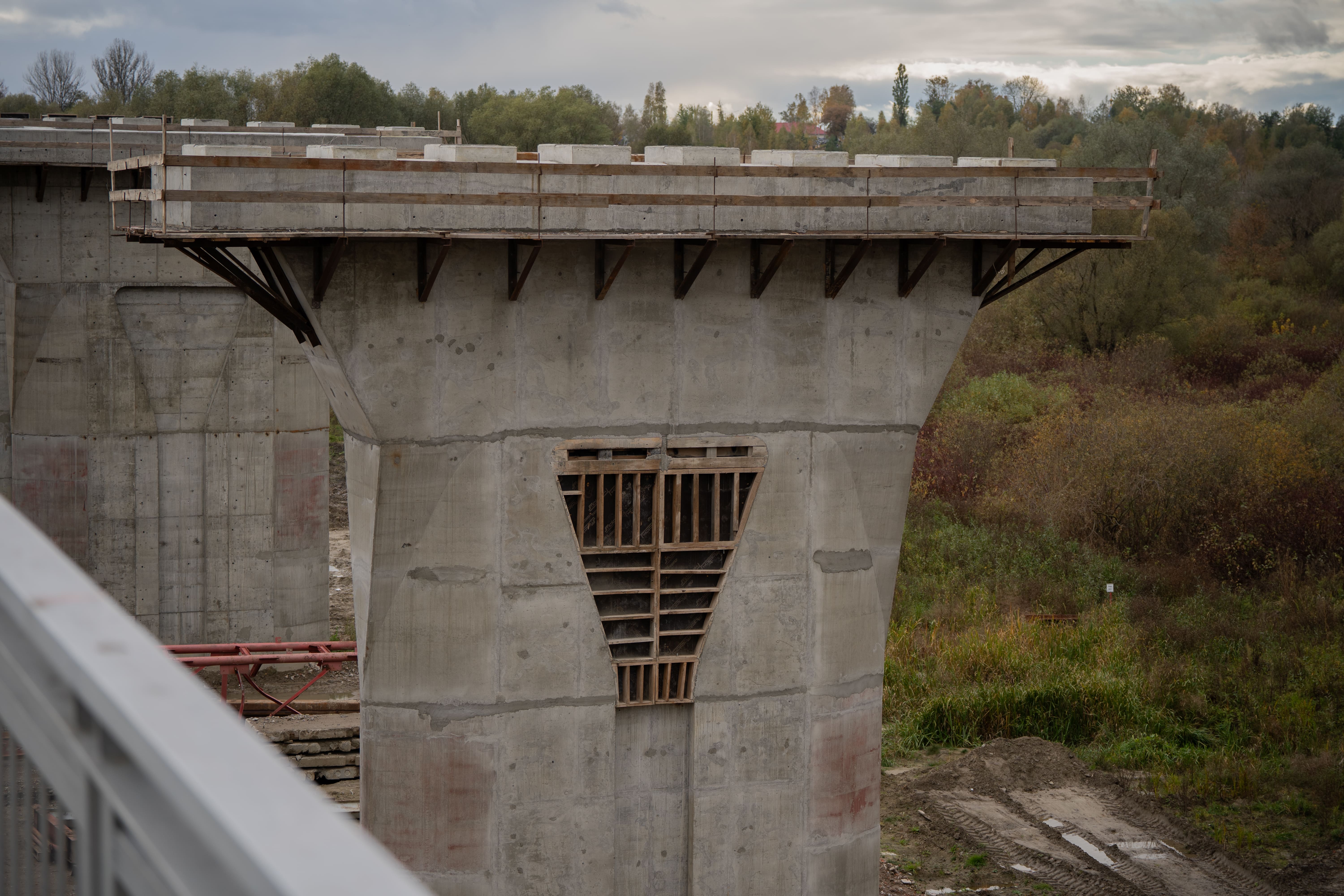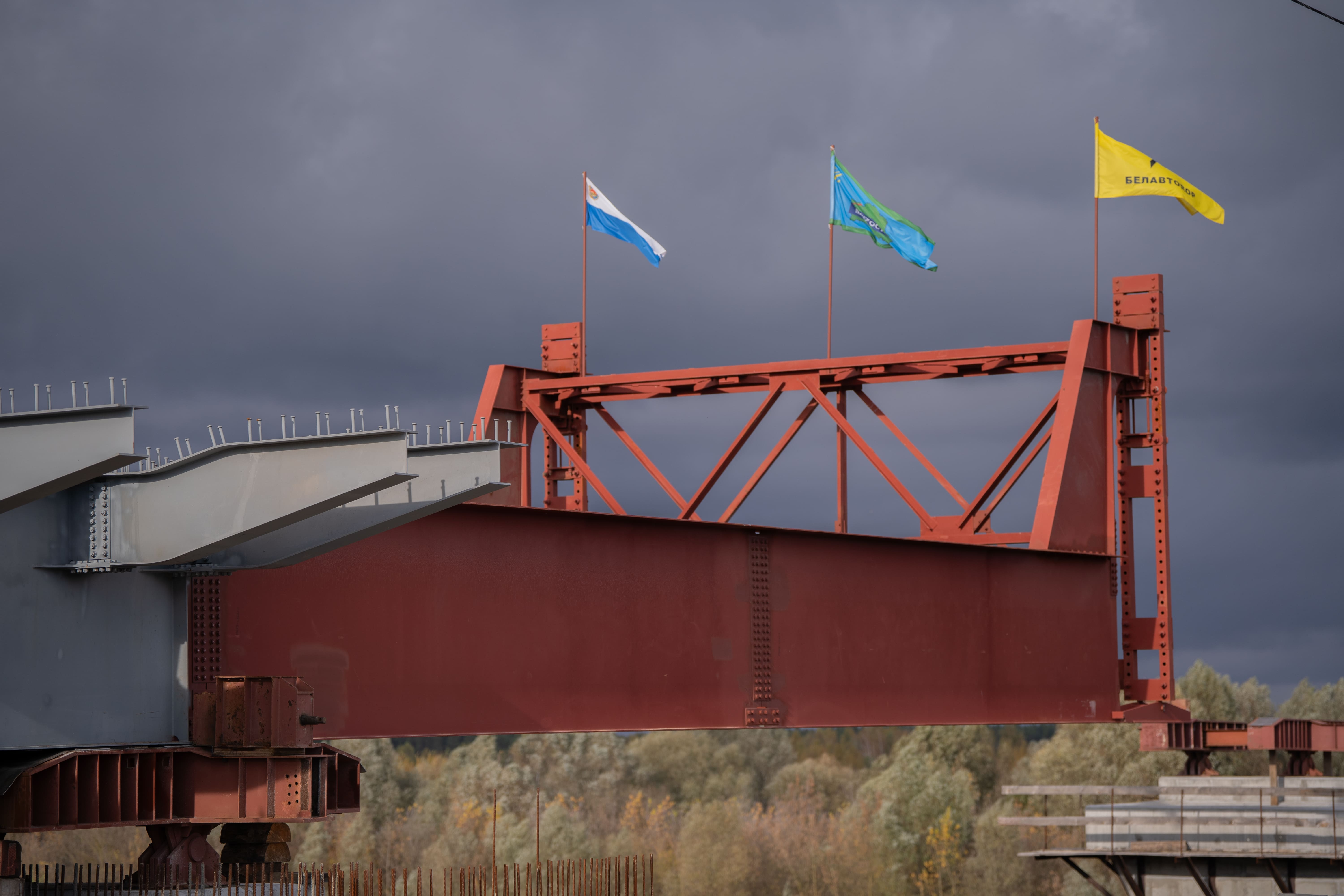 В строительном городке находятся 30 человек, которые трудятся на объекте каждый день по 12 часов. Полным ходом идет продвижение конструкции к середине моста. Без учета демонтажа старого сооружения осталось возвести четыре опоры. Все составляющие оперативно поставляются с Молодечненского завода металлоконструкций. Возводить металлический гигант строителям помогают четыре крана, экскаваторы, компрессоры и погрузчики.