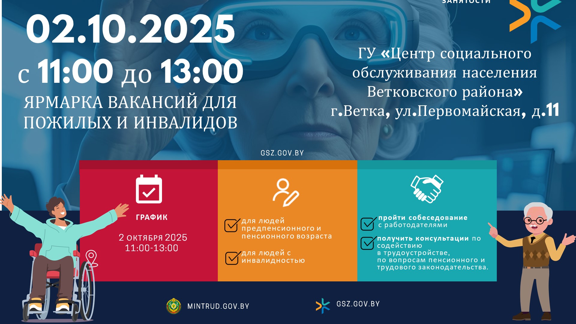 02.10.2025 с 11:00 до 13:00 на базе ГУ «Центр социального обслуживания населения Ветковского района» (г.Ветка, ул.Первомайская, 11) пройдет ярмарка вакансий для людей предпенсионного и пенсионного возраста и людей с инвалидностью.