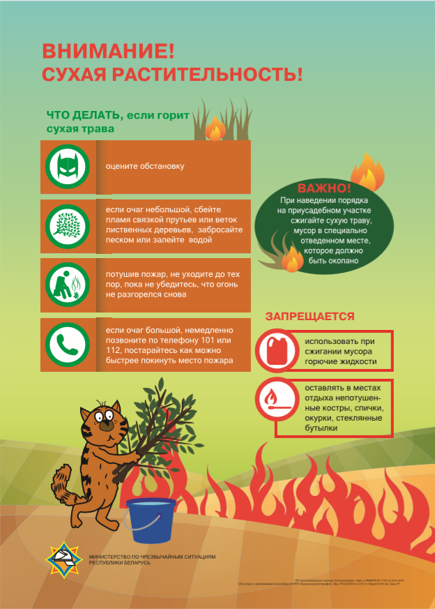 Кожная вясна прыносіць з сабой пагрозу ўзнікнення пажараў з-за спальвання леташняй сухой расліннасці. Многія людзі, асабліва на сельскіх тэрыторыях, звяртаюцца да гэтага метаду, каб падрыхтаваць, на іх думку, глебу да новага сезона пасеваў. Але ж меркаванне памылковае! Пры выпальванні сухой травы парушаецца каранёвая сістэма раслін, ад высокай тэмпературы глеба і расліннасць бяднеюць, знішчаецца ўрадлівы пласт, гінуць карысныя парасткі, казуркі і жывёлы.