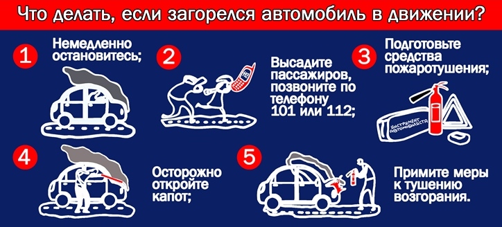 МЧС напоминает! Если вы почувствовали запах палёной резины, либо бензина в салоне — немедленно остановите машину и выясните причину. В случае возникновения возгорания вам необходимо: